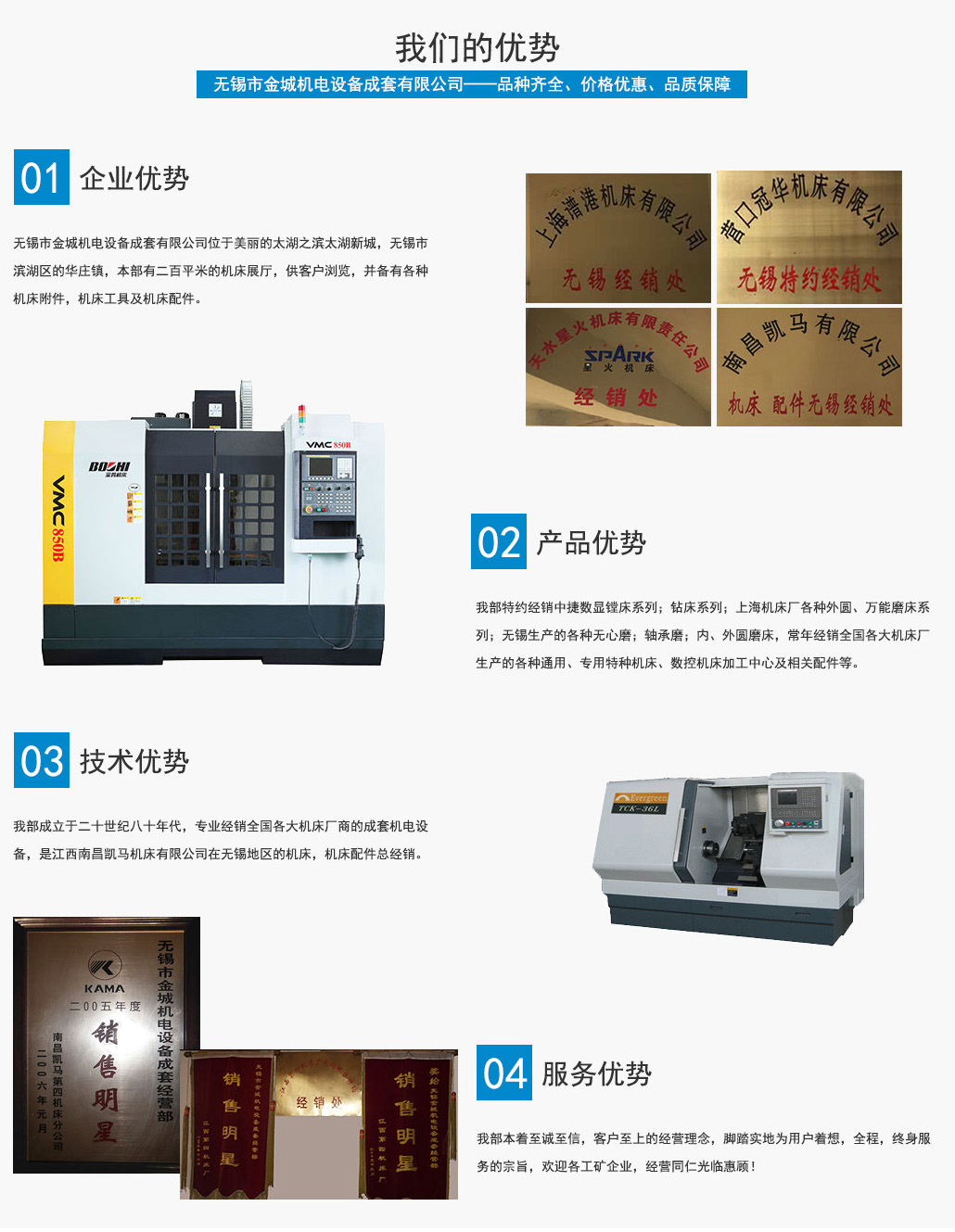無錫市金城機(jī)電設(shè)備成套有限公司位于美麗的太湖之濱太湖新城,無錫市濱湖區(qū)的華莊鎮(zhèn),本部有二百平米的機(jī)床展廳,供客戶瀏覽,并備有各種機(jī)床附件,機(jī)床工具及機(jī)床配件。 我部成立于二十世紀(jì)八十年代,專業(yè)經(jīng)銷全國(guó)各大機(jī)床廠商的成套機(jī)電設(shè)備,是江西南昌凱馬機(jī)床有限公司在無錫地區(qū)的機(jī)床,機(jī)床配件總經(jīng)銷。系蘭州里海機(jī)床有限公司,天水星火...